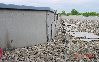 Auf der Dachfläche über 8.OG. ist die Attika erheblich beschädigt. Entlang der Attika ist die Faserzementverblendung der Attikabrüstung fast durchgängig durchfeuchtet und verbogen. Bei den Dachflächen steht die gesamte Folie in Folge von Schrumpfungserscheinungen durch Weichmacherverlust unter extremer Spannung.